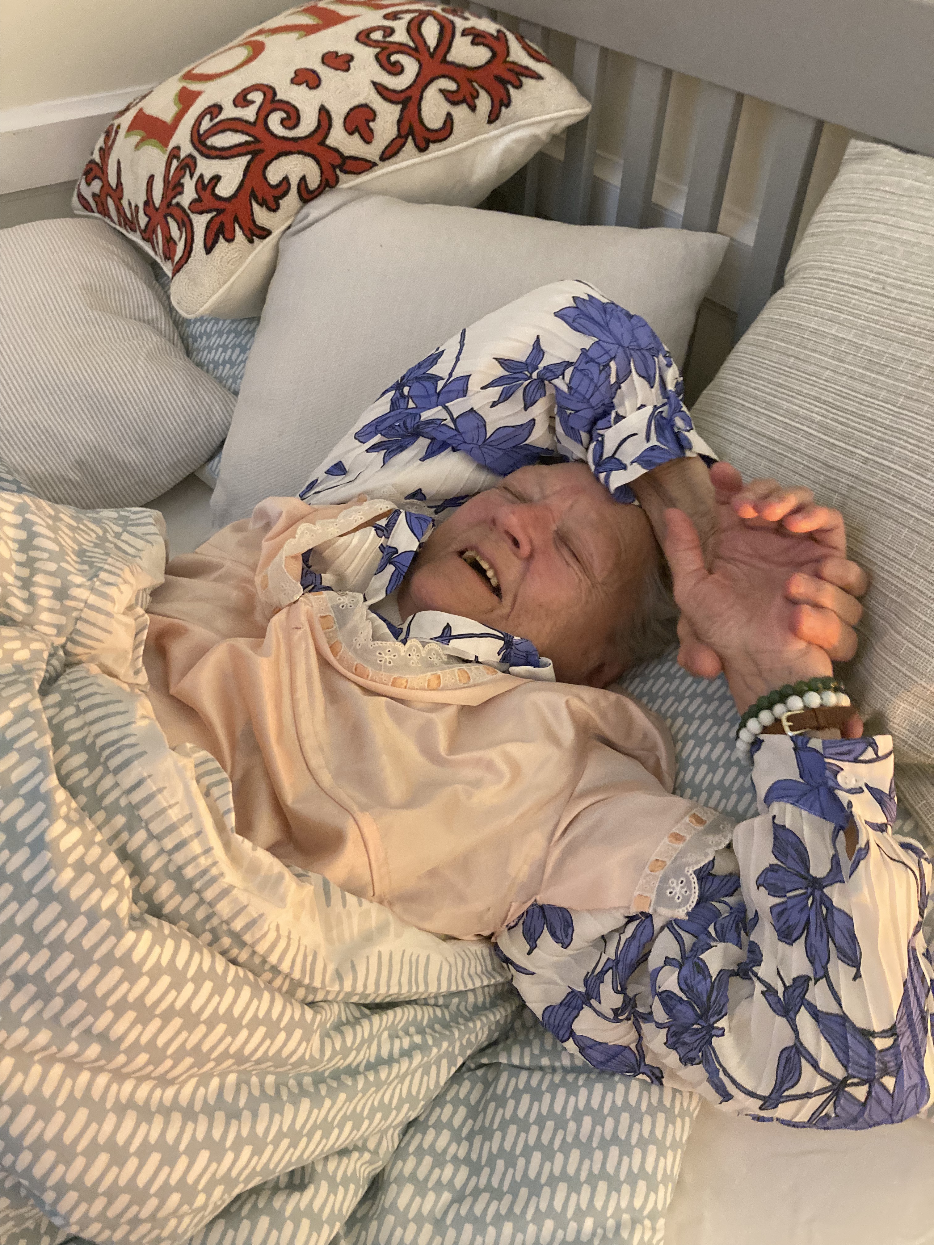 I make sure she has a bottle of water to drink, and put a hot water bottle in her bed. She is getting undressed and is standing with her legs apart, her tracksuit bottoms now around her ankles on the floor. She has discovered a skirt underneath them – heaven knows how long it has been around her waist. Imagine getting undressed and finding garments you didn’t know you were wearing.