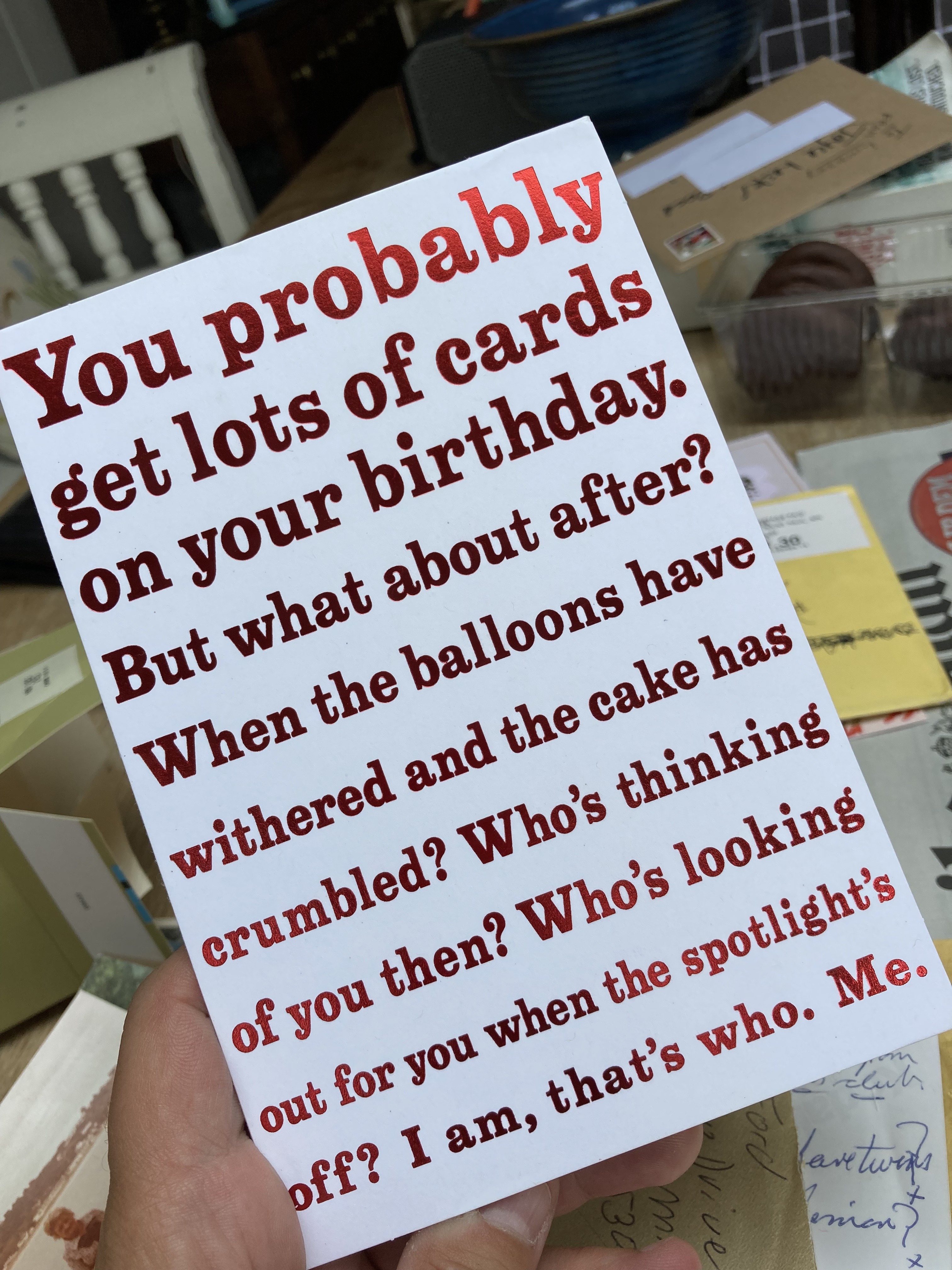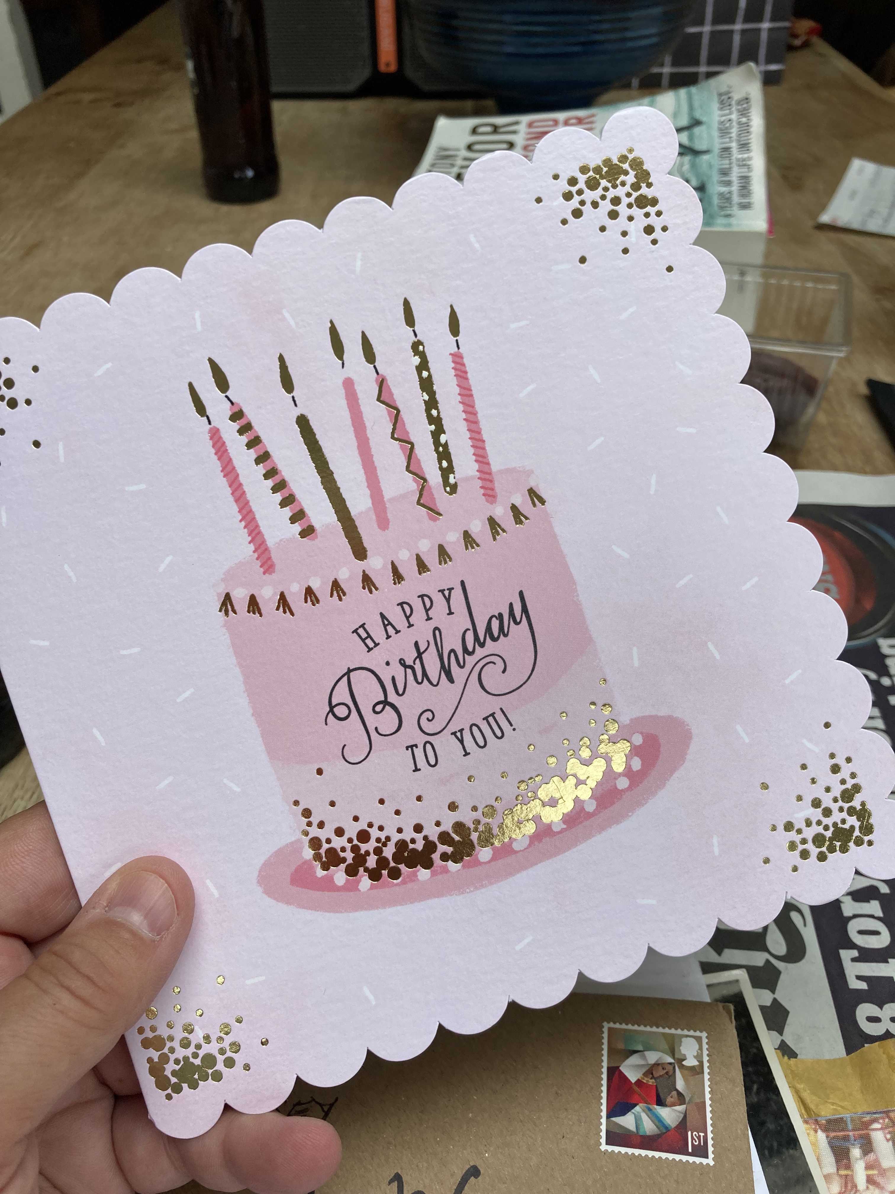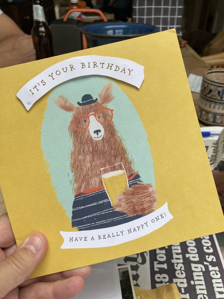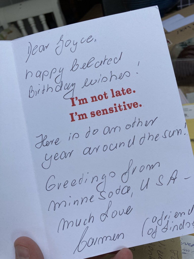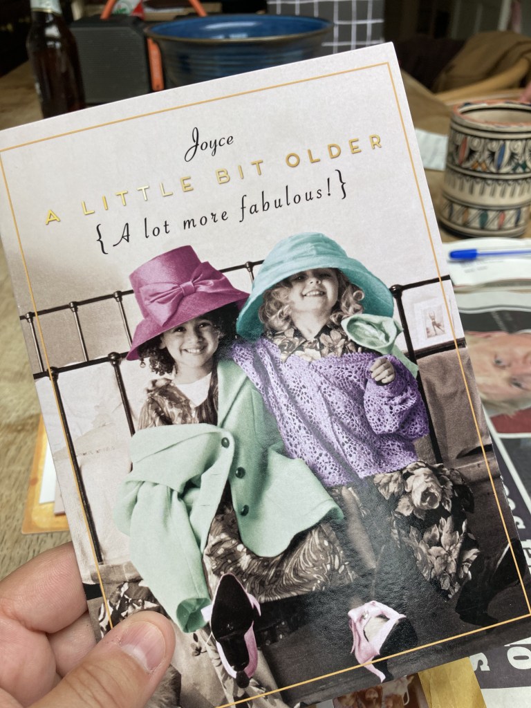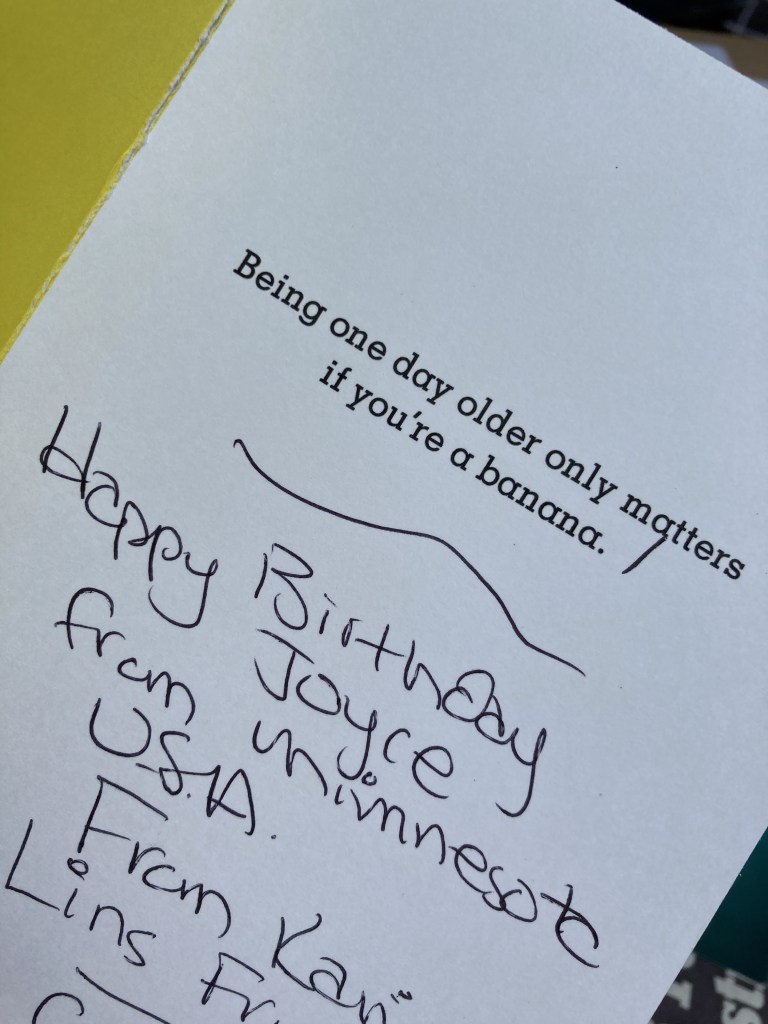 - A selection of the birthday cards which she was sent this year. I suggest we go through them at the BNB when we have more time, but she insists on showing me a few anyway. She loves her cards, and when re-reading, always gives the impression that it’s actually the first time she’s read that card. I guess that’s the dodgy memory again.