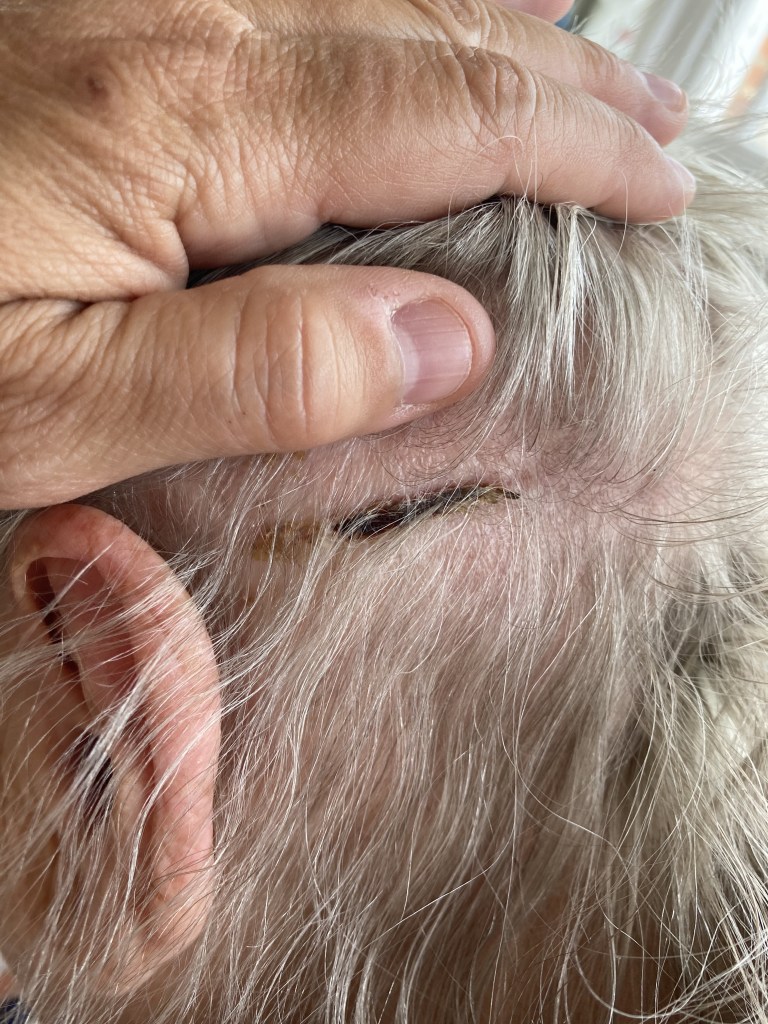 Mum’s account of receiving the injury is that she was assaulted in Bradford about 2 weeks ago, that she was on a pedestrian bit and somebody threw something at her which hit her on the head. Subsequent questions just leave more unanswered. She’s sure someone threw a missile, yet there was no one around, nor was there anything on the ground when she looked to see what had hit her. She didn’t report it to the police, and claimed to have been “shopping”. She didn’t go to a & e, because we all know how long that takes and she could have caught covid, so she just went home and went to bed. Only in the morning when her head was stuck to the pillow did she realise that it had been bleeding and was probably more significant than she first thought.