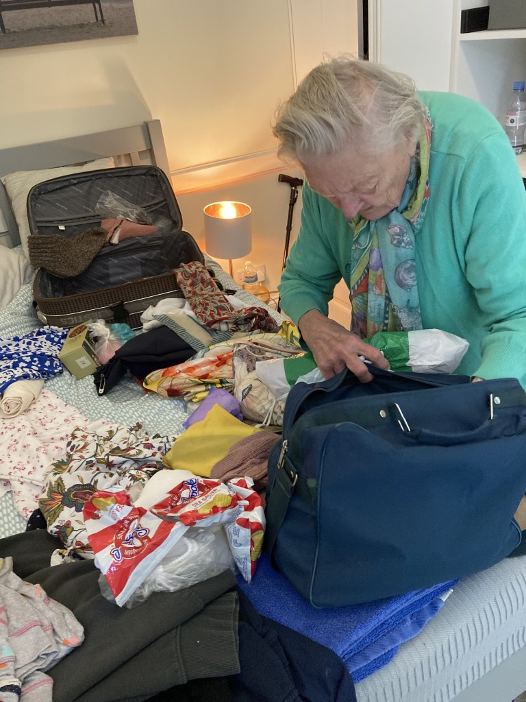 I make sure she has a bottle of water to drink, and put a hot water bottle in her bed. She is getting undressed and is standing with her legs apart, her tracksuit bottoms now around her ankles on the floor. She has discovered a skirt underneath them – heaven knows how long it has been around her waist. Imagine getting undressed and finding garments you didn’t know you were wearing.